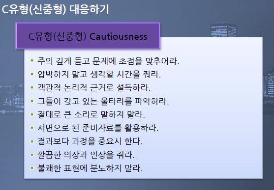 - C 타입을 대할 땐 타인과 상호작용하며 결정을 하고자 노력하는 것이 효과적임