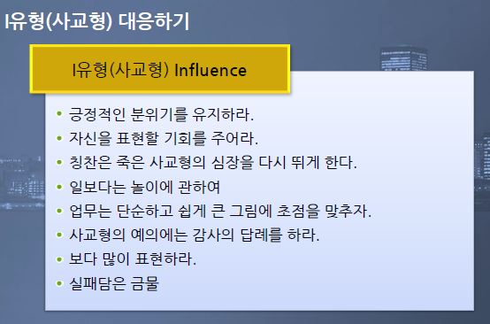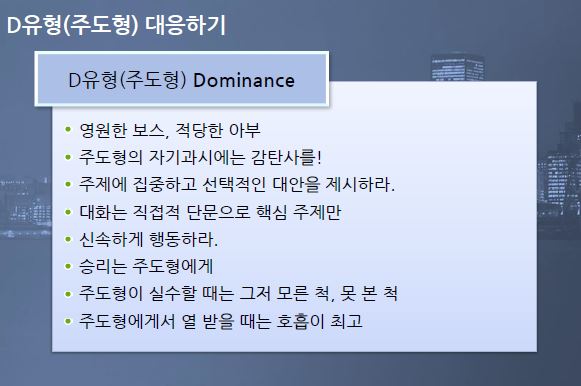 - D 타입을 대할 땐 주의깊게 들으며 자신이 생각하는 것을 설명하는 것이 효과적임