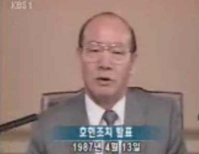 1987년 4월 13일 5공 독재자 전두환 대통령이 국민들의 민주화 요구를 거부하고, 일체의 개헌 논의를 중단시킨 조치.