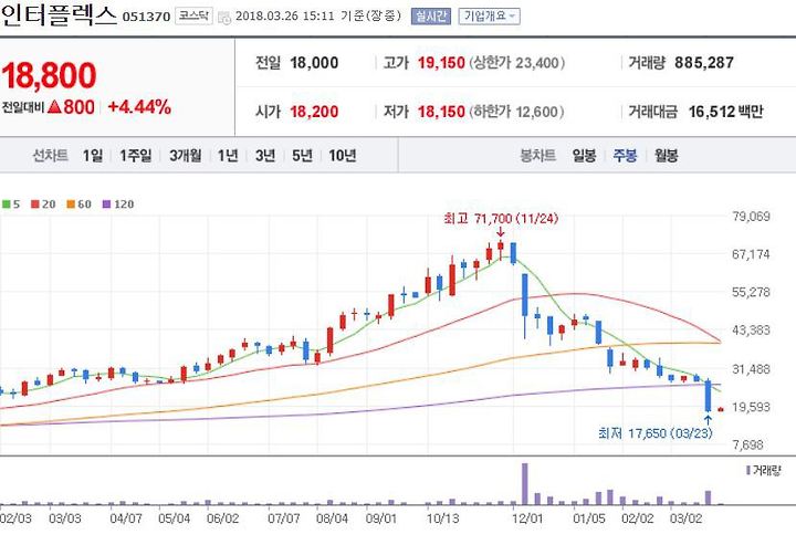 인터플렉스는 작년 한해 천장이 어디인지도 모를만큼 끝없이 치솟다가 작년 11월 24일 최고가 71,700 원을 찍고 나서,