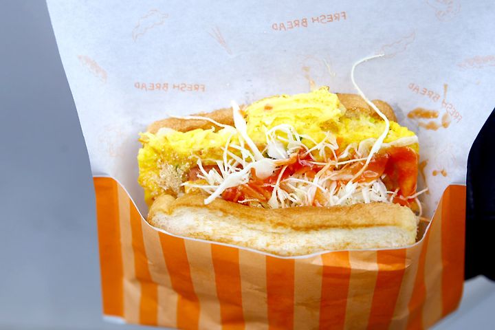 The most popular shop at Myeongdong is Issac Toast which can attract queues that last an hour. But you should be able to find these elsewhere. The Korean Egg Toast comes with thinly shredded vegetables, spam and sprinkled with sugar at the end.