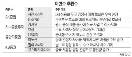 SK증권은 서진시스템(178320)과 GS건설(006360), 한미약품(128940)을 추천했다. 서진시스템은 5G 국내 상용화를 앞두고 커버리지 확대 중이어서 경쟁사 대비 확실한 우위를 선점했다는 평가다. GS건설은 지난해 4·4분기 매출액 3조 2,656억원, 영업이익 2,173억원으로 전년 동기 대비 각각 3.2%, 111.8% 증가한 호실적을 기록해 주가 상승이 전망된다. 실적 호조의 이유는 국내 주택 부문의 성장과 해외 프로젝트 마무리 효과로 분석된다. 한미약품은 중국 법인인 북경한미의 고성장이 실적 개선을 견인할 것으로 기대된다.