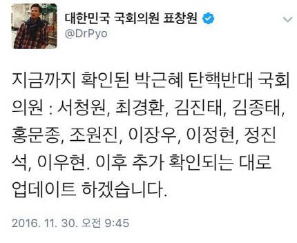 표창원 의원이 공개한 탄핵반대 국회의원 명단이다. 아주 잘한 일이다.