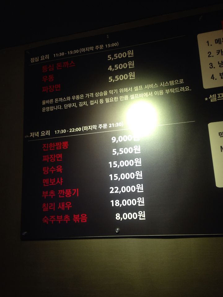 총 5명의 남자가 가서 위의 메뉴에 짬뽕 한 그릇 추가로 더 시키고 연태고량주 두병 먹었는데 배도 부르고 괜찮았습니다.