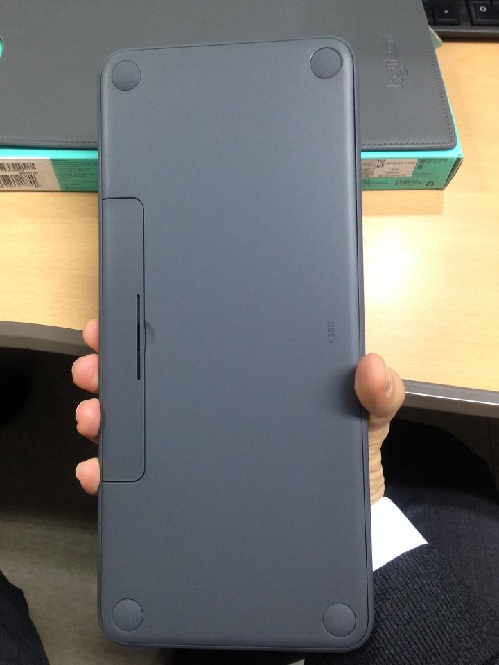 키보드 뒷판입니다. 상품 구매하면 AAA 건전지 두개가 이미 키보드에 들어가 있습니다. 제품 설명서에 따르면 이 배터리로 2년간이나 사용할 수 있다는데, 그건 함 봐야겠죠. 하지만 적어도 1년은 쓰지 않을까 싶습니다. 제 집에 있는 LG블루투스 키보드도 건전지 들어가는데, 1년에 한번정도 배터리 가는가 싶습니다. 이 제품도 그러한 면에서 1년에 한번정도만 배터리 갈면되지 않을까 싶구요, 저는 원래 충전할 수 있는 블루투스 키보드를 선호하는 사람인데, 또 한편으론 이러한 점에서 충전을 당분간은 신경쓸 필요가 없다는 점이 K380의 장점이 될 수도 있는 거 같습니다.