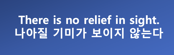 나아질 기미가 보이지 않는다를 영어로 어떻게 말할까요? 바로, There is no relief in sight. 라고 하시면 됩니다. 1.There is:이 부분은 존재를 나타내는 표현입니다. "There is"는 ”~있다"는 의미를 가지며, 어떤 상황이나 상태가 존재하고 있음을 나타냅니다. 2. no relief:여기서 "no relief"는 "안도감이 없음" 또는 "구제책이 없음"을 뜻합니다. 즉, 현재의 고통이나 어려움에서 벗어날 방법이나 희망이 없다는 의미입니다. 3. in sight:이 표현은 "보이는 곳에" 또는 "가까운 곳에"라는 의미로, 무언가가 곧 일어날 가능성이 있음을 암시합니다. There is no relief in sight.나아질 기미가 보이지 않는다 아래 유튜브로도 확인해보..